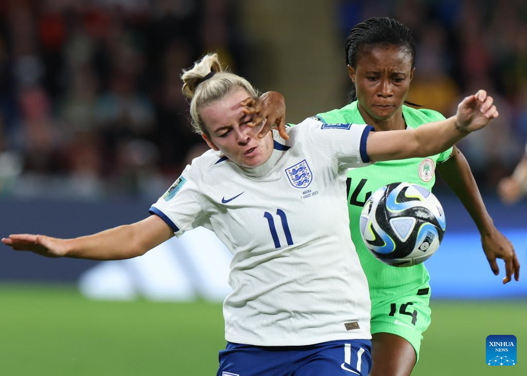 England's Lauren Hemp (L) vies with Nigeria's Blessing Demehin during the round of 16 match between England and Nigeria at the 2023 FIFA Women's World Cup in Brisbane, Australia, Aug. 7, 2023. (Xinhua/Ding Ting)
