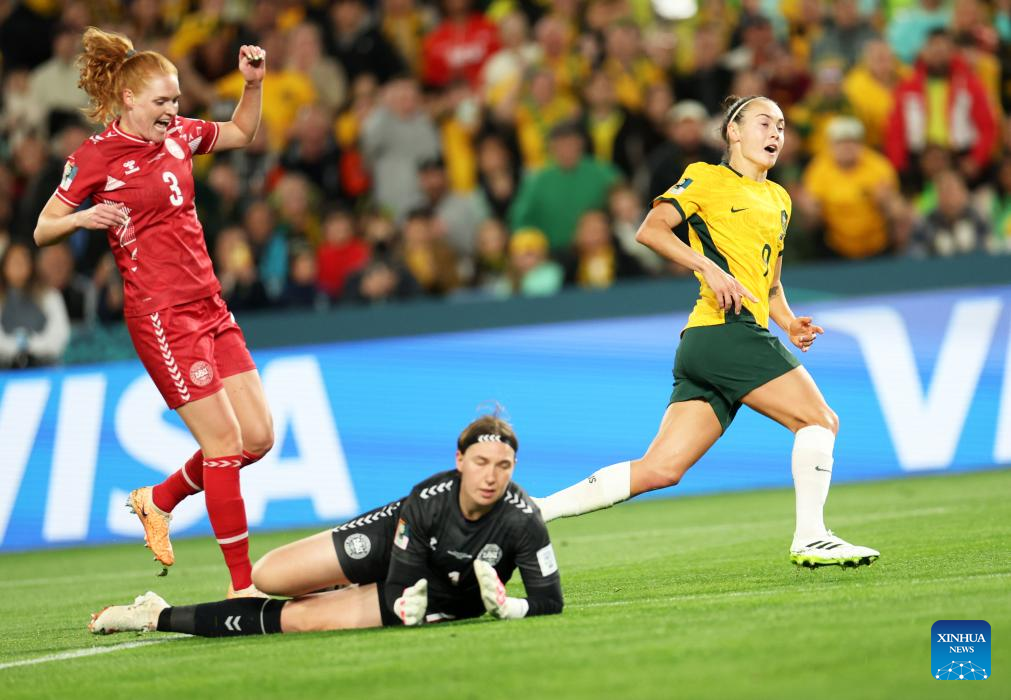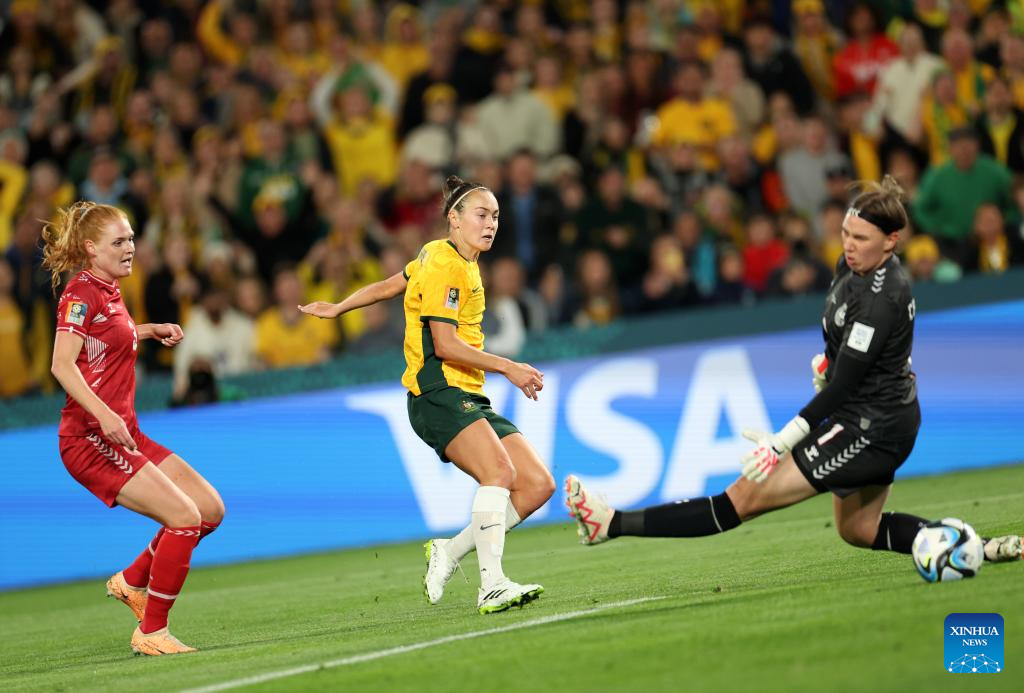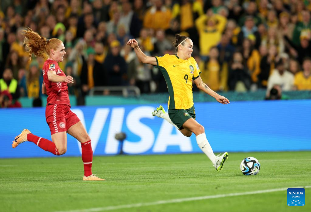 Australia's Caitlin Foord (R) shoots to score during the round of 16 match between Australia and Denmark at the 2023 FIFA Women's World Cup in Sydney, Australia, Aug. 7, 2023. (Xinhua/Qin Lang)