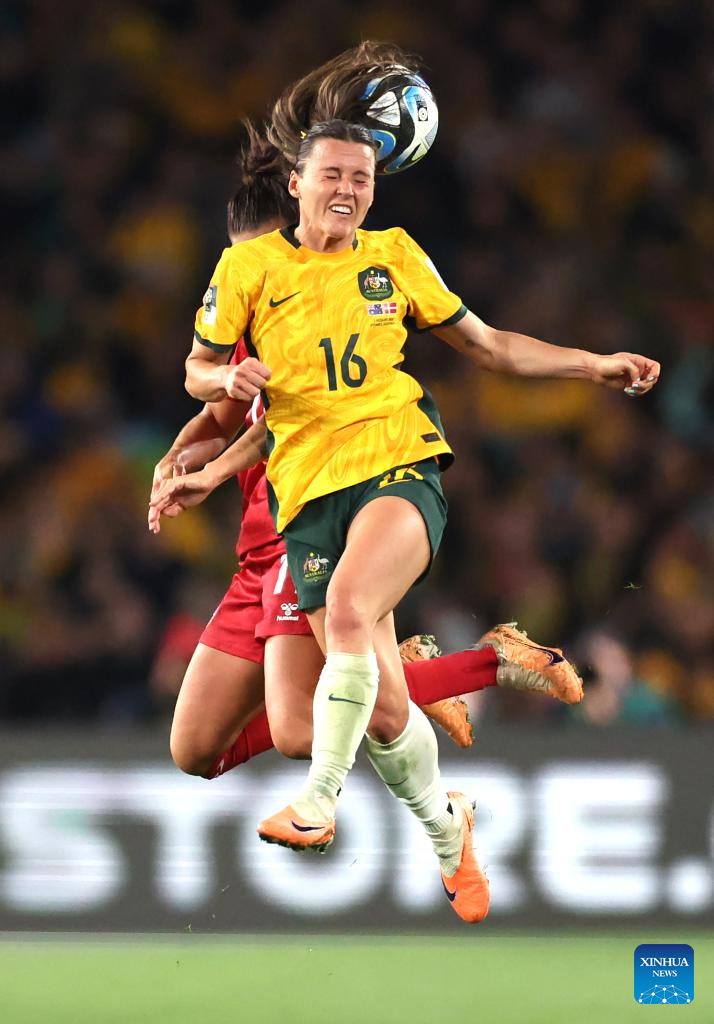 Australia's Hayley Raso vies for a header during the round of 16 match between Australia and Denmark at the 2023 FIFA Women's World Cup in Sydney, Australia, Aug. 7, 2023. (Xinhua/Zhang Chen)