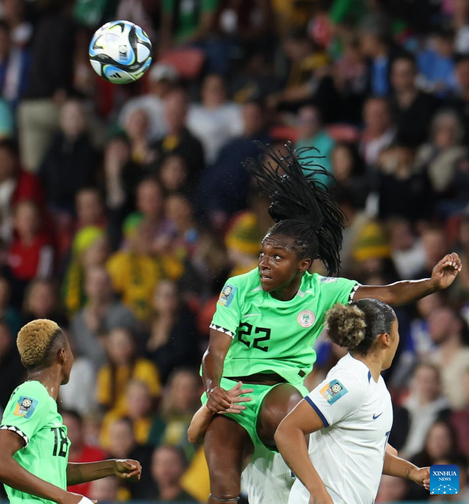 Nigeria's Michelle Alozie (C) heads the ball during the round of 16 match between England and Nigeria at the 2023 FIFA Women's World Cup in Brisbane, Australia, Aug. 7, 2023. (Xinhua/Ding Ting)