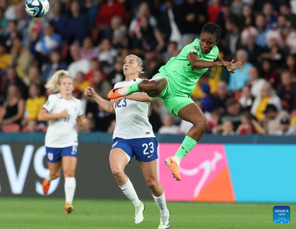 Nigeria's Christy Ucheibeu (L) vies for the ball during the round of 16 match between England and Nigeria at the 2023 FIFA Women's World Cup in Brisbane, Australia, Aug. 7, 2023. (Xinhua/Li Yibo)