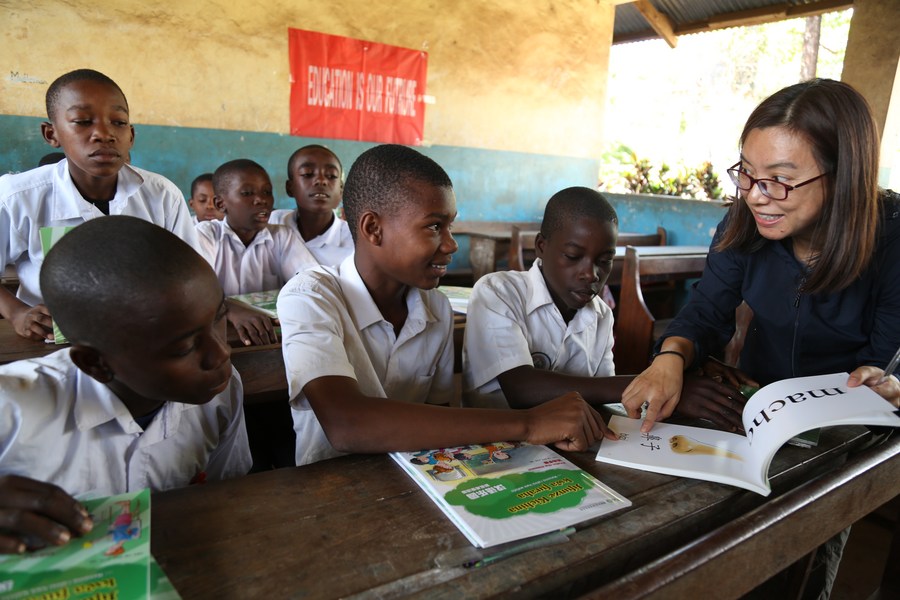 Li Yaya teaches students Chinese characters in Zanzibar, Tanzania, on July 20, 2023. (Photo by Herman Emmanuel/Xinhua)