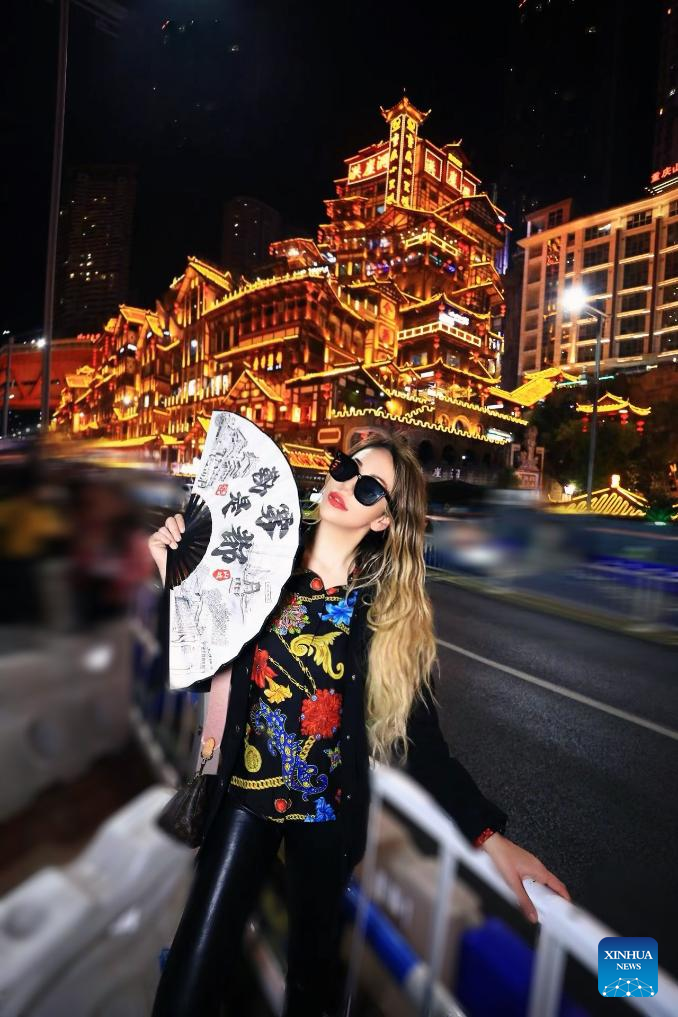 Yasmin Von Roon poses for photos in front of Hongya Cave, a popular tourist attraction in southwest China's Chongqing, on April 27, 2023. Italian girl Yasmin Von Roon is a successful online influencer with 110,000 fans on TikTok, but she still recalls the strong emotional impact of learning about Marco Polo's travels. (Xinhua)