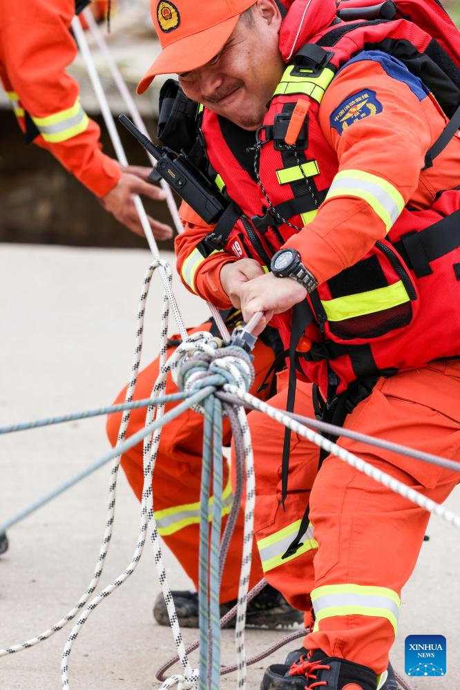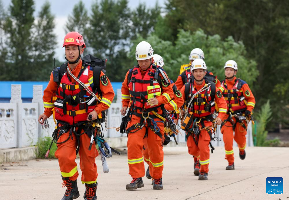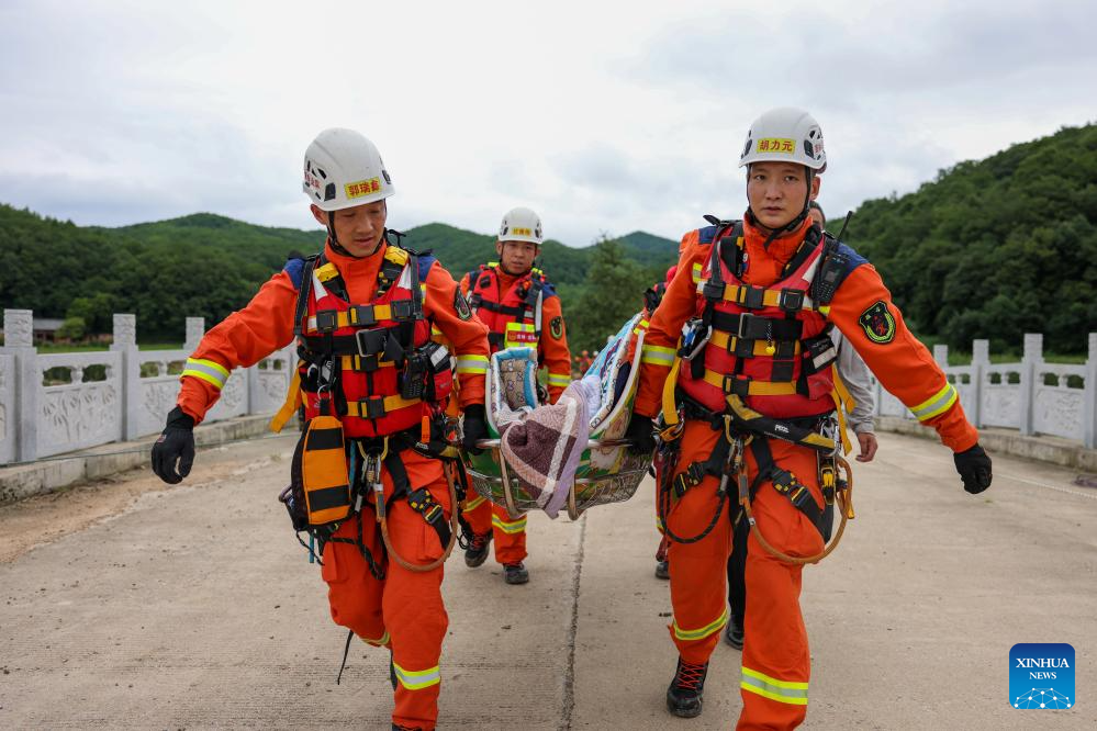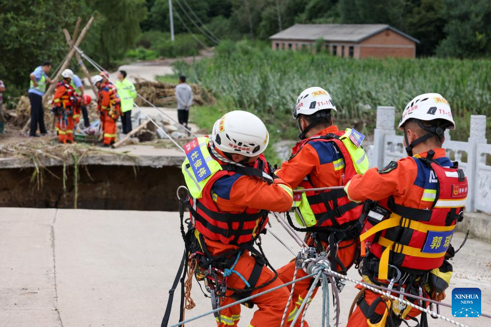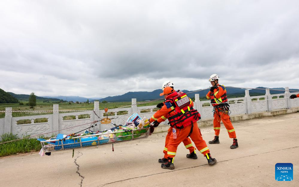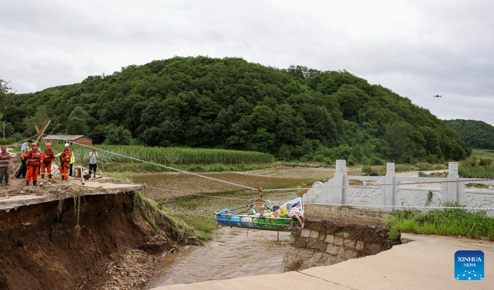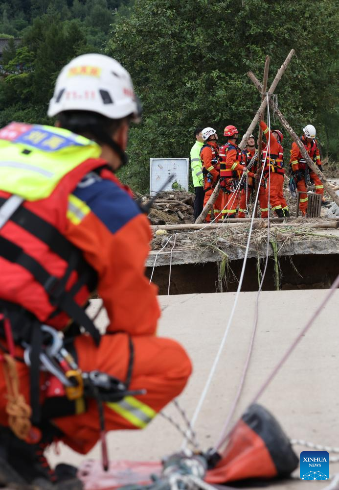 Rescuers set up a rope rescue system on the collapsed bridge in Kaiyuan Town of Shulan City, northeast China's Jilin Province, Aug. 6, 2023. Shulan City has been experiencing continuous rainy weather since Tuesday night. Continuous heavy rainfall have caused floods in several towns of Shulan. When the flood hit here, the villagers in Xinkai Village of Kaiyuan Town moved to the resettlement sites one after another, but Qu Fengxia, 74, became the last trapped person in Xinkai Village because she was ill in bed all the year round and was inconvenient to move.