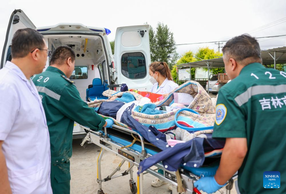 Qu Fengxia is transferred to a hospital in Shulan City, northeast China's Jilin Province, Aug. 6, 2023. Shulan City has been experiencing continuous rainy weather since Tuesday night. Continuous heavy rainfall have caused floods in several towns of Shulan. When the flood hit here, the villagers in Xinkai Village of Kaiyuan Town moved to the resettlement sites one after another, but Qu Fengxia, 74, became the last trapped person in Xinkai Village because she was ill in bed all the year round and was inconvenient to move.