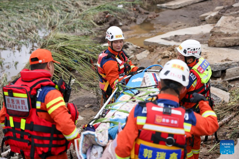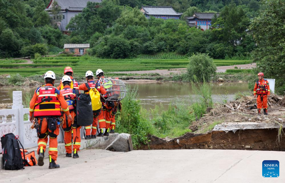Rescuers walk on a collapsed bridge in Kaiyuan Town of Shulan City, northeast China's Jilin Province, Aug. 6, 2023. Shulan City has been experiencing continuous rainy weather since Tuesday night. Continuous heavy rainfall have caused floods in several towns of Shulan. When the flood hit here, the villagers in Xinkai Village of Kaiyuan Town moved to the resettlement sites one after another, but Qu Fengxia, 74, became the last trapped person in Xinkai Village because she was ill in bed all the year round and was inconvenient to move.