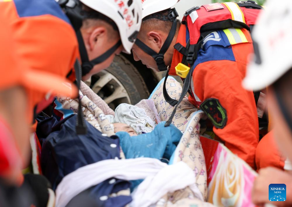 In order to relocate Qu Fengxia, rescuers set up a rope rescue system on the collapsed bridge, successfully transferring Qu Fengxia from the trapped point and transporting her to hospital for treatment. (Xinhua/Yan Linyun)