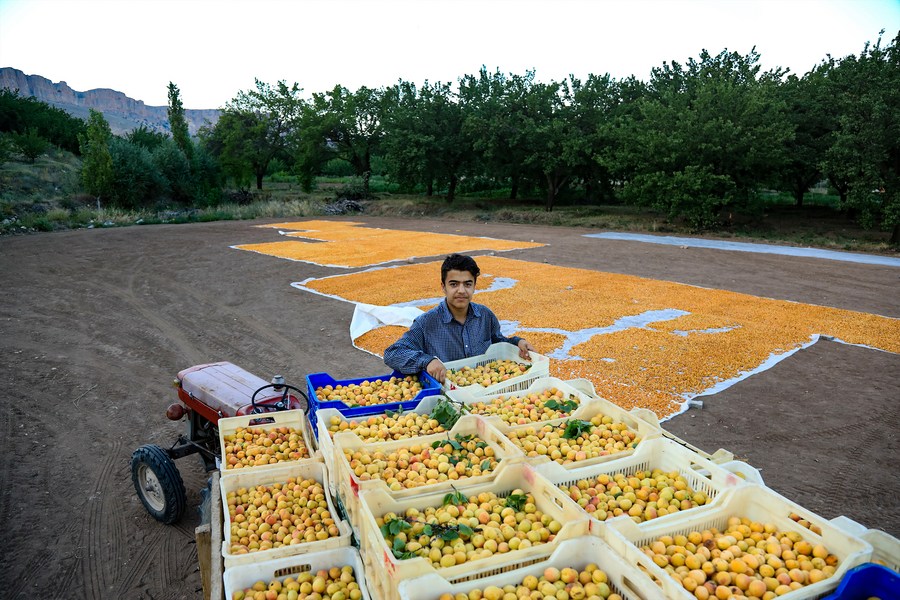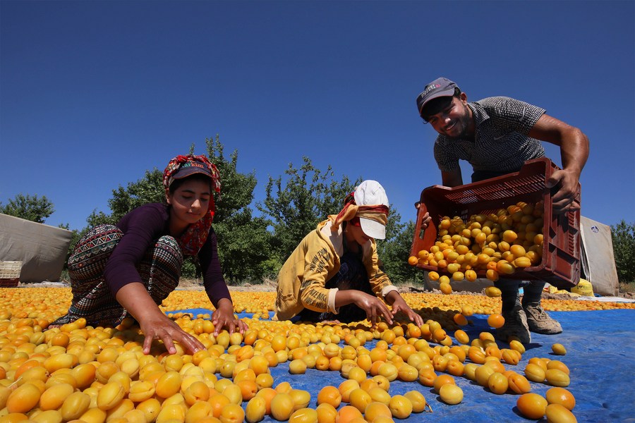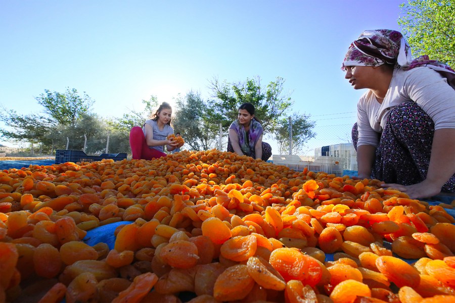 People dry apricots in Malatya, central Türkiye, on Aug. 6, 2023. (Mustafa Kaya/Handout via Xinhua)