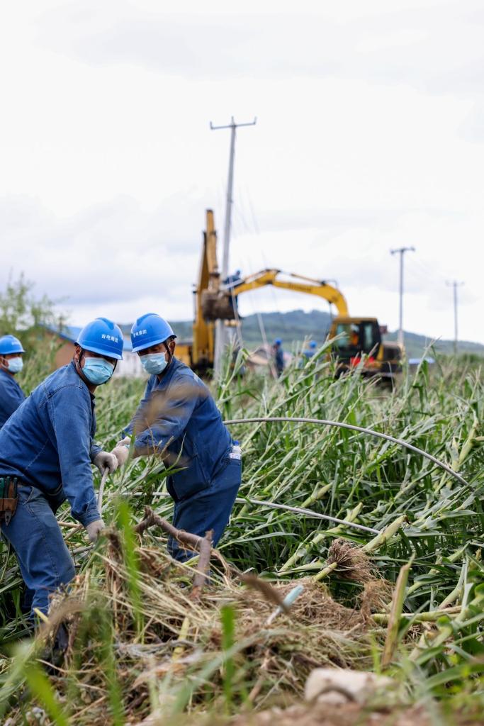 Workers repair wire damaged by flood water in Kaiyuan Town of Shulan City, northeast China's Jilin Province, Aug. 6, 2023. (Xinhua/Yan Linyun)