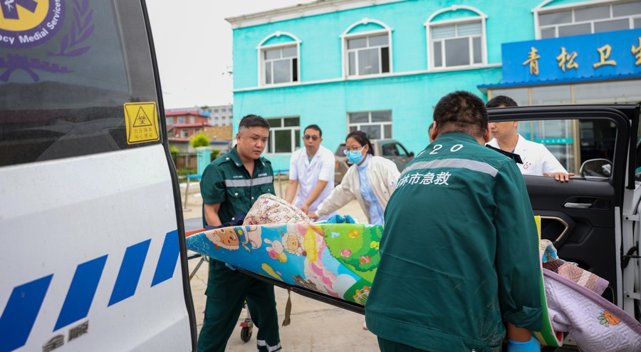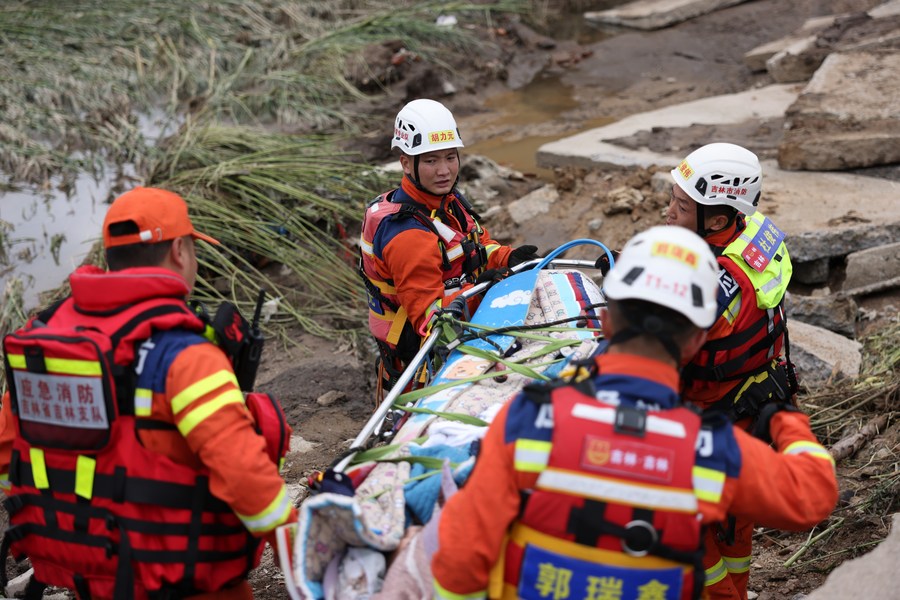 Medical workers transfer a trapped person to a hospital in Shulan City, northeast China's Jilin Province, Aug. 6, 2023. (Xinhua/Yan Linyun)
