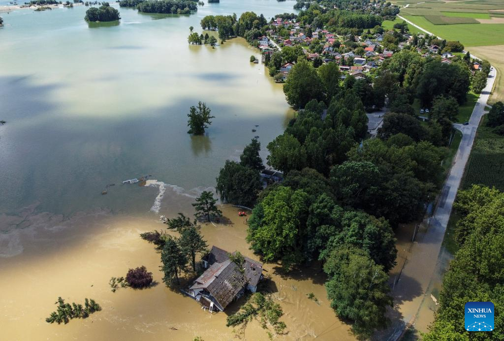 This aerial photo taken on Aug. 8, 2023 shows flooded houses after heavy rainfall near Koprivnica, Croatia. (Igor Soban/PIXSELL via Xinhua)