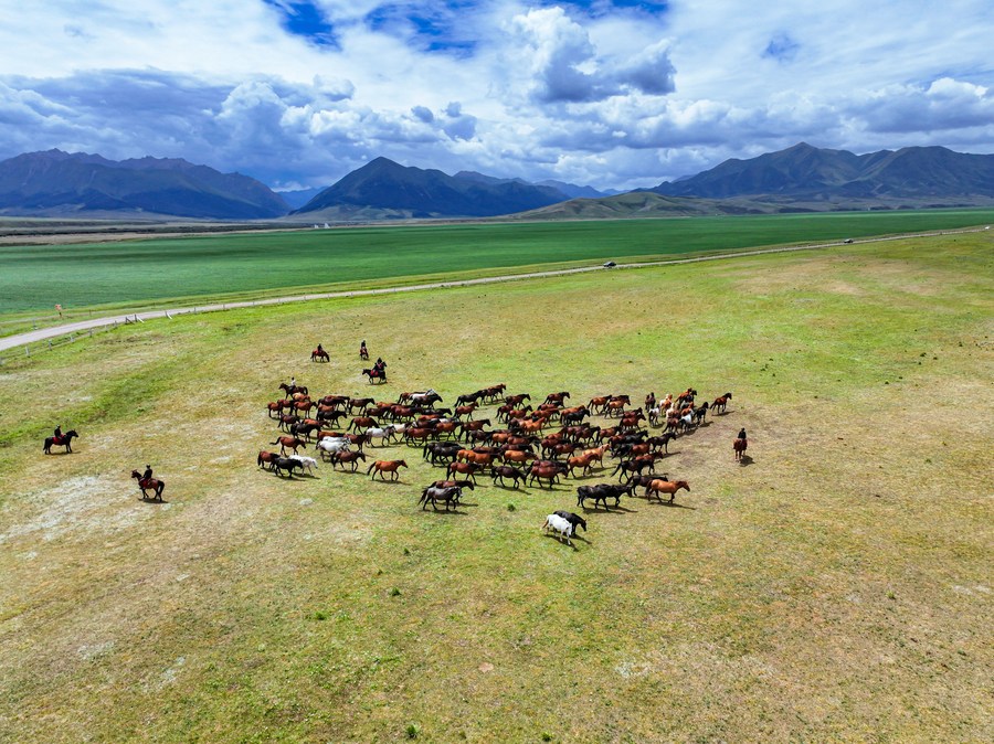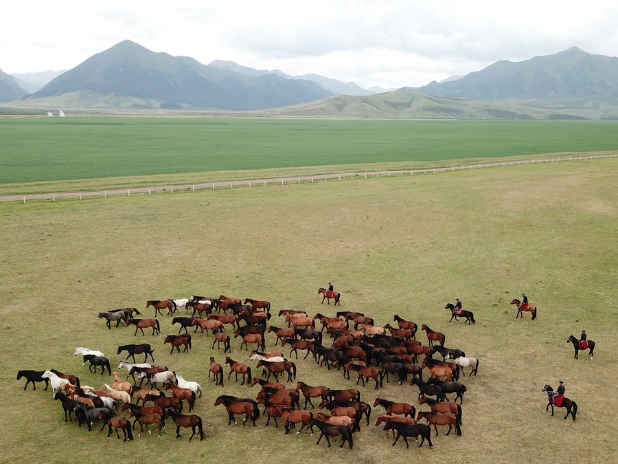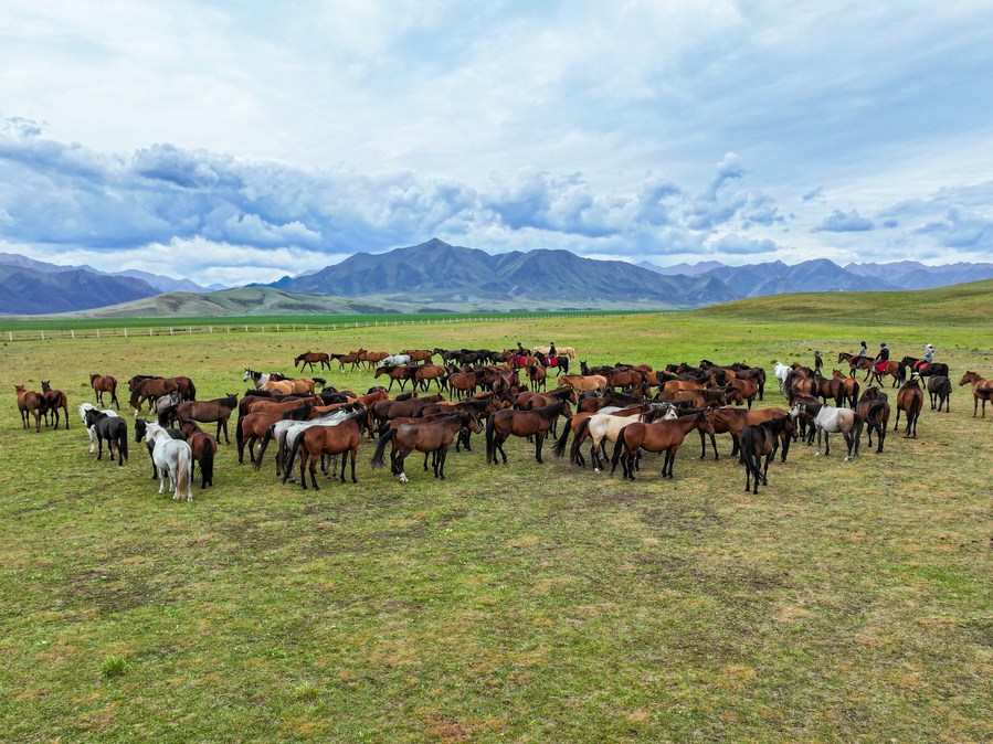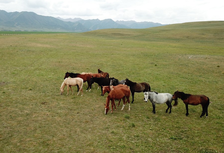 This aerial photo taken on Aug. 6, 2023 shows Shandan horses at the Shandan Horse Breeding Farm in Shandan County, Zhangye City, northwest China's Gansu Province. (Xinhua/Zhang Keren)