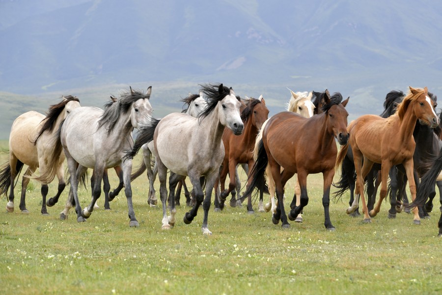 This photo taken on Aug. 6, 2023 shows Shandan horses at the Shandan Horse Breeding Farm in Shandan County, Zhangye City, northwest China's Gansu Province. (Xinhua/Fan Peishen)