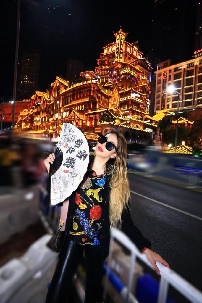 Yasmin Von Roon poses for photos in front of Hongya Cave, a popular tourist attraction in southwest China's Chongqing, on April 27, 2023. (Xinhua)
