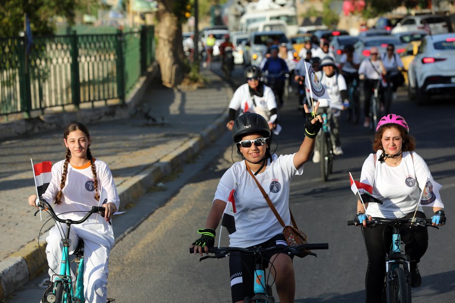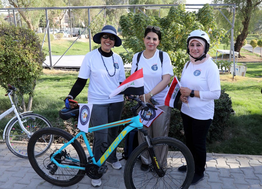 Female cyclists participate in an event to raise awareness of the harmful effects of drugs in Baghdad, Iraq, on Aug 5, 2023. (Xinhua/Khalil Dawood)