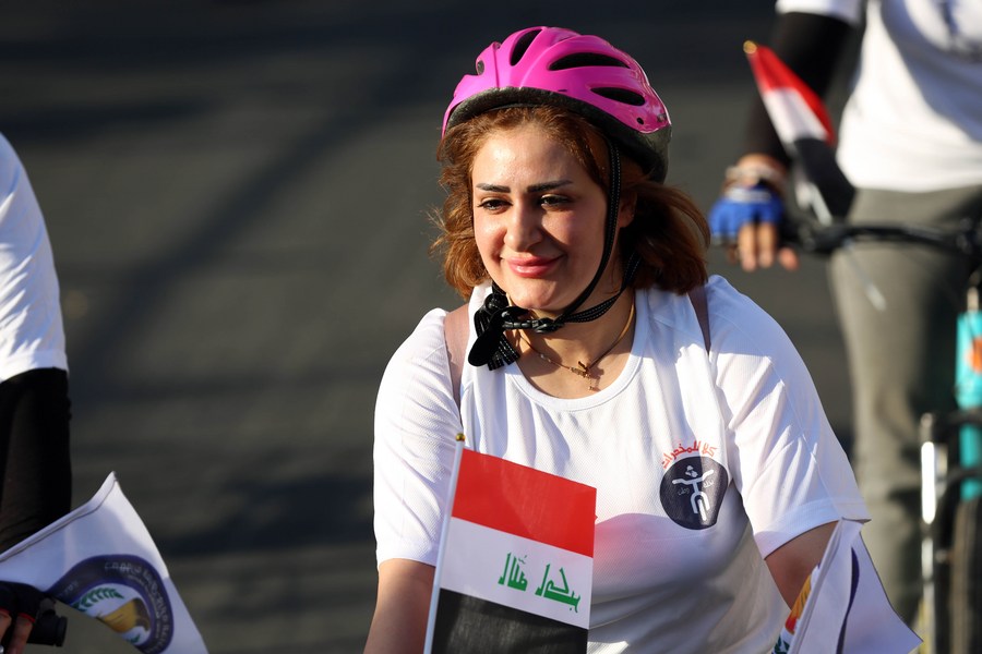 A female cyclist participates in the marathon to raise awareness of the harmful effects of drugs in Baghdad, Iraq, on Aug 5, 2023. (Xinhua/Khalil Dawood)