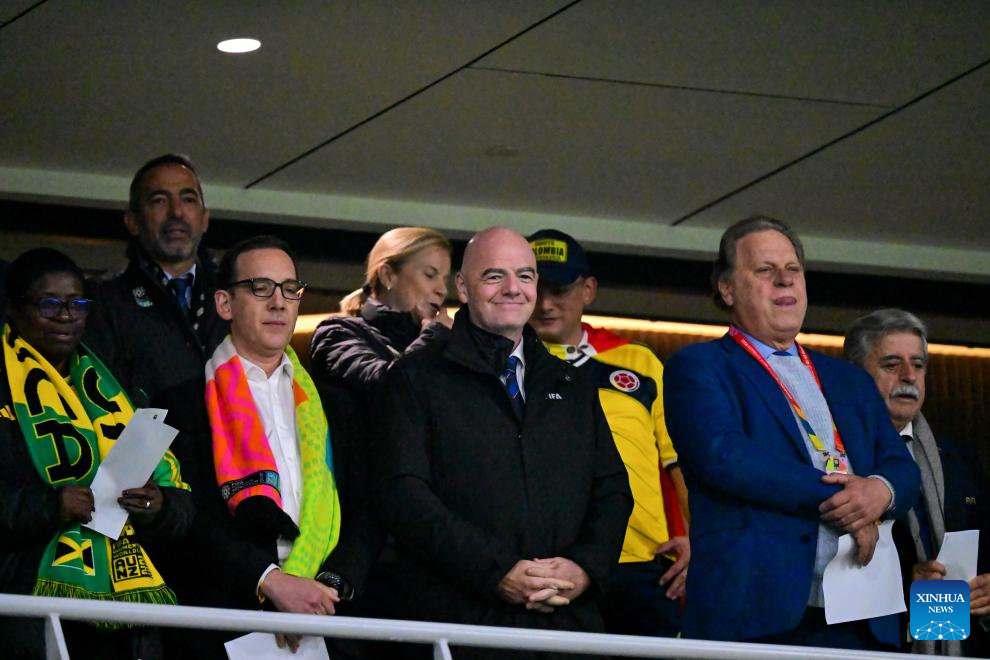 FIFA president Gianni Infantino (front 2nd R) watches the round of 16 match between Colombia and Jamaica at the 2023 FIFA Women's World Cup in Melbourne, Australia, Aug. 8, 2023. (Xinhua/Zhu Wei)