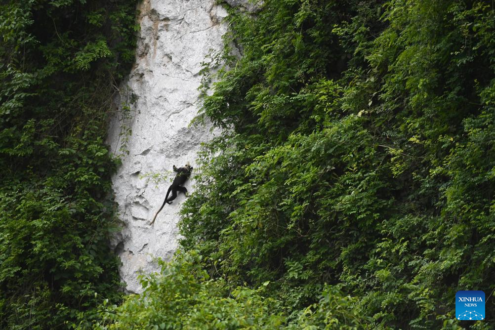 A white-headed langur climbs on a cliff at a national nature reserve in Luobai Town of Jiangzhou District, Chongzuo City, south China's Guangxi Zhuang Autonomous Region, Aug. 5, 2023. China's white-headed langur is one of the world's most endangered primate species. Characterized by the white hair on their heads, the animals are spotted in less than 200 square km karst hills between the Zuojiang and Mingjiang rivers in Chongzuo.