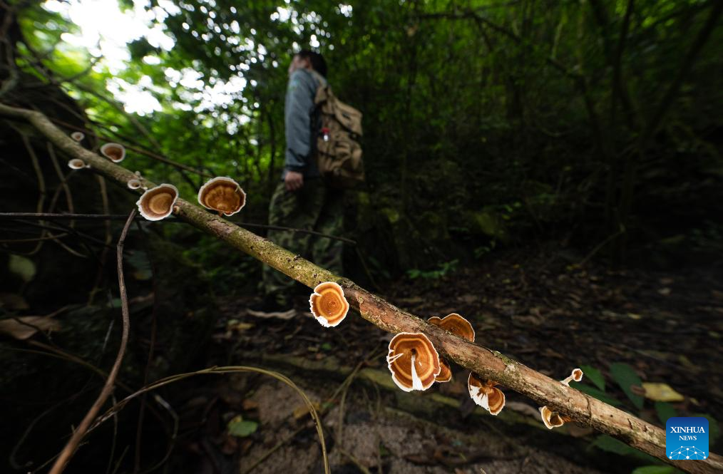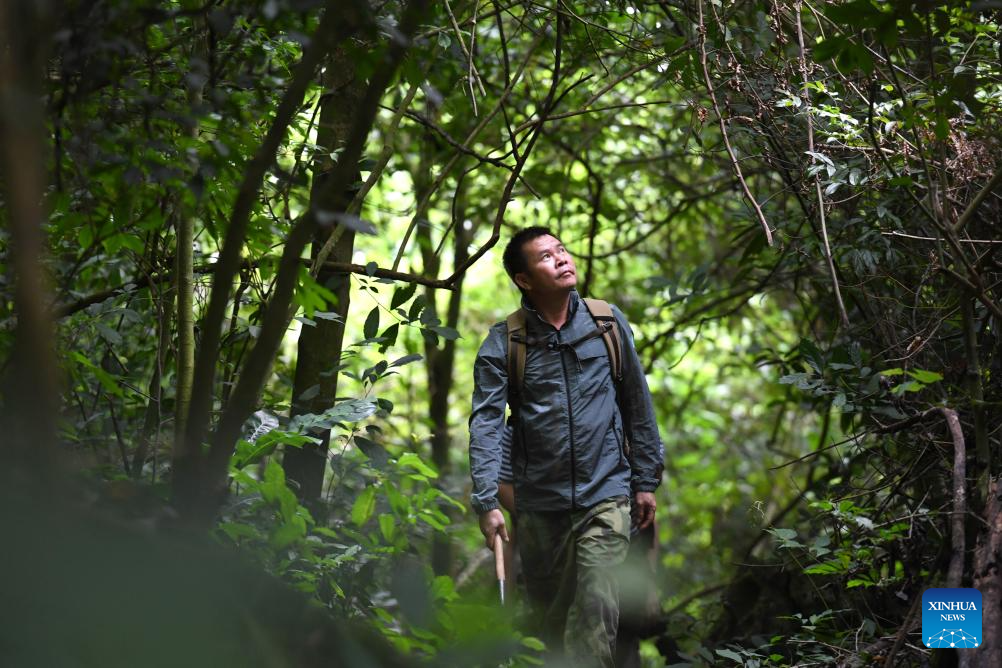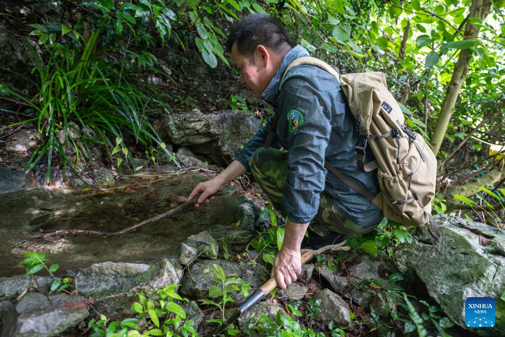Ranger Liang Zhizhang moves away a tree branch from a watering place made for white-headed langurs during a patrol at a national nature reserve in Luobai Town of Jiangzhou District, Chongzuo City, south China's Guangxi Zhuang Autonomous Region, Aug. 4, 2023. China's white-headed langur is one of the world's most endangered primate species. Characterized by the white hair on their heads, the animals are spotted in less than 200 square km karst hills between the Zuojiang and Mingjiang rivers in Chongzuo.