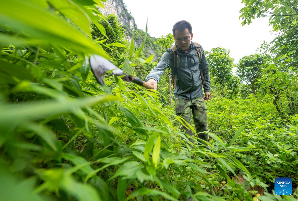 Ranger Liang Zhizhang cuts down bushes with a machete to make way during a patrol at a national nature reserve in Luobai Town of Jiangzhou District, Chongzuo City, south China's Guangxi Zhuang Autonomous Region, Aug. 4, 2023. China's white-headed langur is one of the world's most endangered primate species. Characterized by the white hair on their heads, the animals are spotted in less than 200 square km karst hills between the Zuojiang and Mingjiang rivers in Chongzuo.