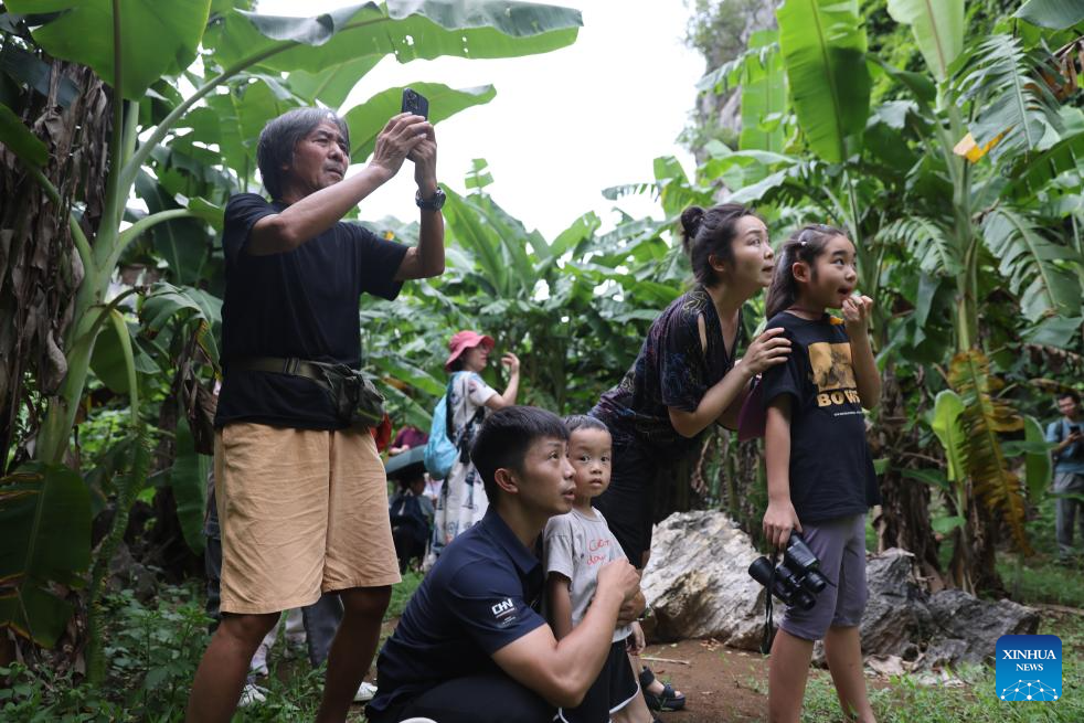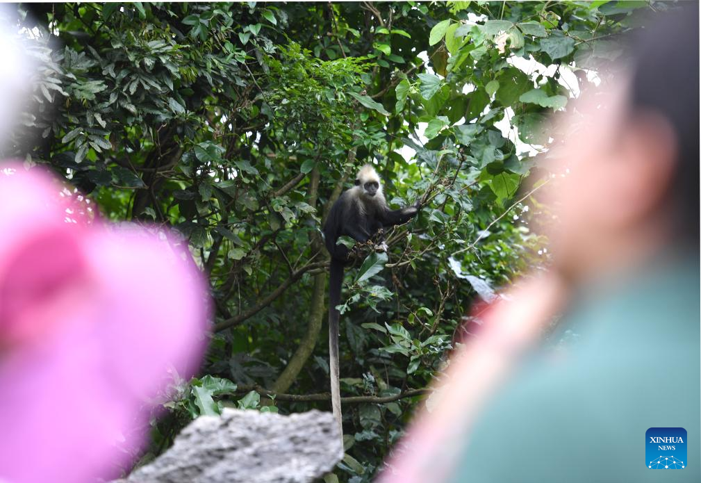 Tourists view white-headed langurs at a national nature reserve in Luobai Town of Jiangzhou District, Chongzuo City, south China's Guangxi Zhuang Autonomous Region, Aug. 5, 2023. China's white-headed langur is one of the world's most endangered primate species. Characterized by the white hair on their heads, the animals are spotted in less than 200 square km karst hills between the Zuojiang and Mingjiang rivers in Chongzuo.