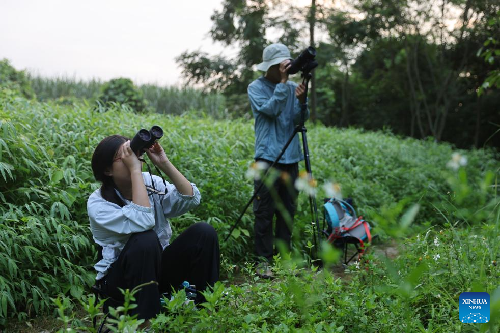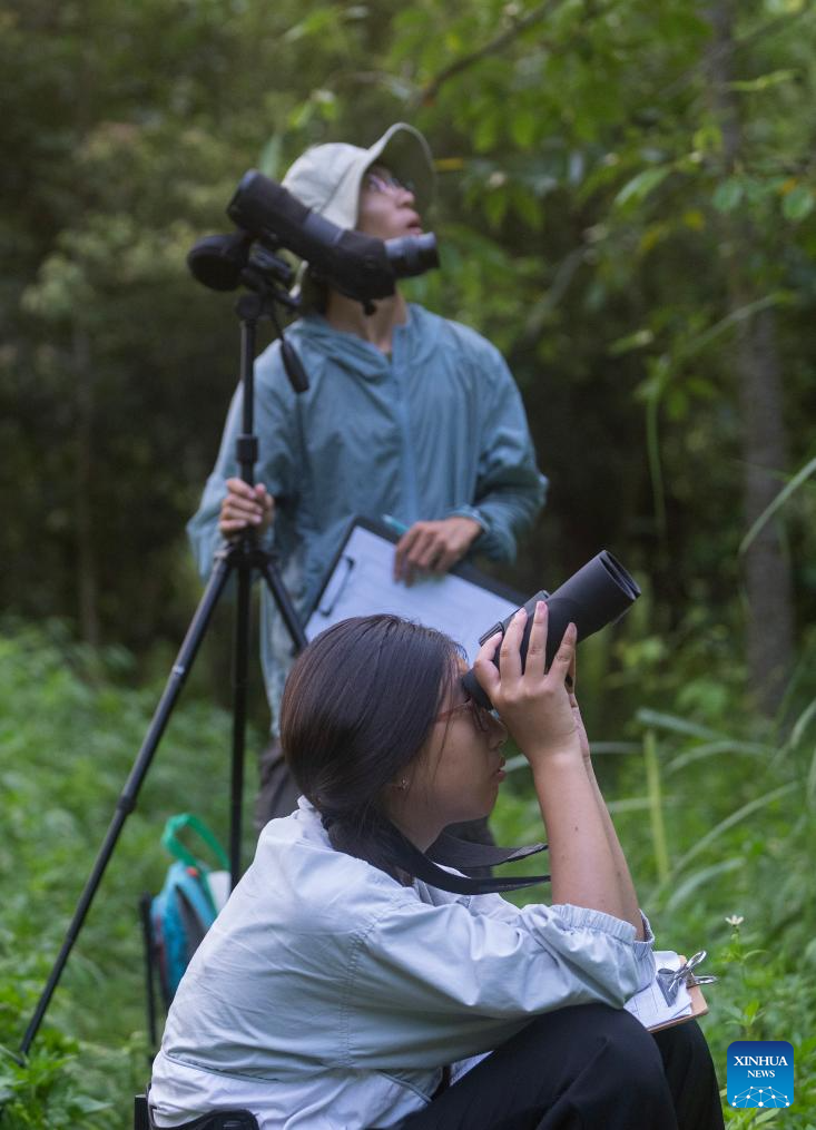 Researcher Li Wenqin (R) and Liu Yanchen observe white-headed langurs at a national nature reserve in Luobai Town of Jiangzhou District, Chongzuo City, south China's Guangxi Zhuang Autonomous Region, Aug. 5, 2023. China's white-headed langur is one of the world's most endangered primate species. Characterized by the white hair on their heads, the animals are spotted in less than 200 square km karst hills between the Zuojiang and Mingjiang rivers in Chongzuo.