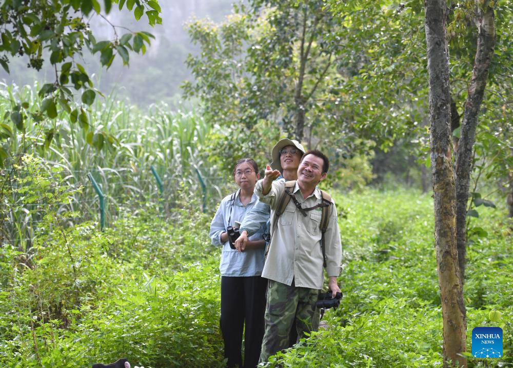 Researcher Li Wenqin (C) and Liu Yanchen and ranger Liang Zhizhang (R) observe white-headed langurs at a national nature reserve in Luobai Town of Jiangzhou District, Chongzuo City, south China's Guangxi Zhuang Autonomous Region, Aug. 5, 2023. China's white-headed langur is one of the world's most endangered primate species. Characterized by the white hair on their heads, the animals are spotted in less than 200 square km karst hills between the Zuojiang and Mingjiang rivers in Chongzuo.