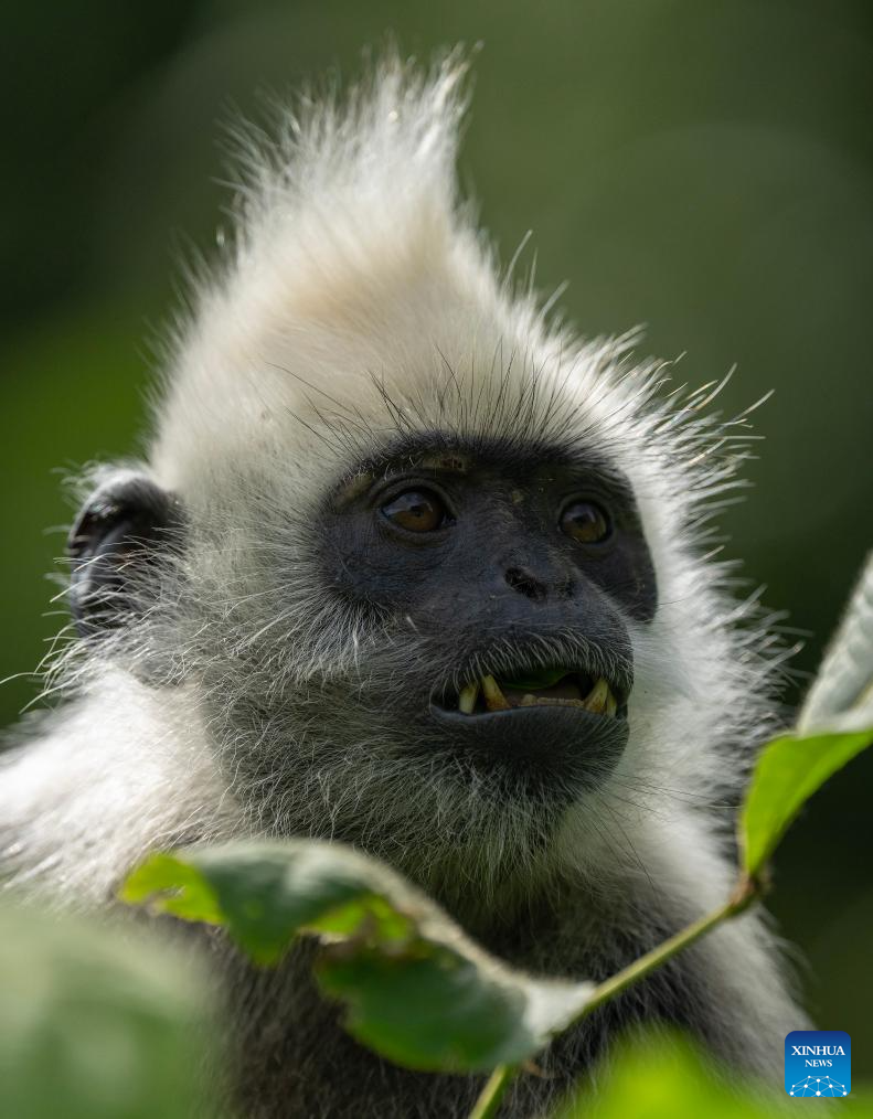 A white-headed langur is pictured at a national nature reserve in Luobai Town of Jiangzhou District, Chongzuo City, south China's Guangxi Zhuang Autonomous Region, Aug. 5, 2023. China's white-headed langur is one of the world's most endangered primate species. Characterized by the white hair on their heads, the animals are spotted in less than 200 square km karst hills between the Zuojiang and Mingjiang rivers in Chongzuo.