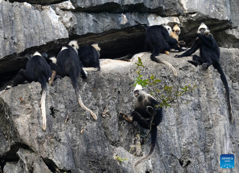 A flock of white-headed langurs rest on a cliff at a national nature reserve in Luobai Town of Jiangzhou District, Chongzuo City, south China's Guangxi Zhuang Autonomous Region, Aug. 5, 2023. China's white-headed langur is one of the world's most endangered primate species. Characterized by the white hair on their heads, the animals are spotted in less than 200 square km karst hills between the Zuojiang and Mingjiang rivers in Chongzuo.
