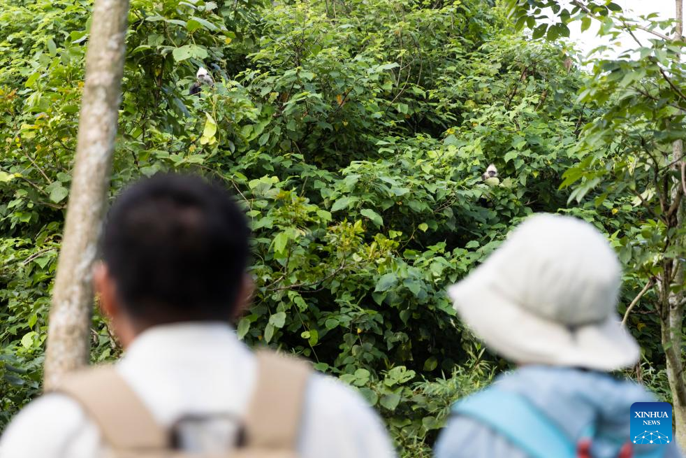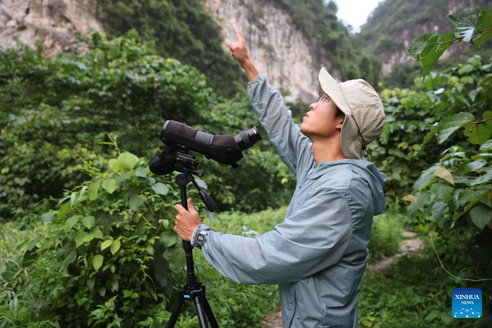 Ranger Liang Zhizhang observes a white-headed langur during a patrol at a national nature reserve in Luobai Town of Jiangzhou District, Chongzuo City, south China's Guangxi Zhuang Autonomous Region, Aug. 5, 2023. China's white-headed langur is one of the world's most endangered primate species. Characterized by the white hair on their heads, the animals are spotted in less than 200 square km karst hills between the Zuojiang and Mingjiang rivers in Chongzuo.