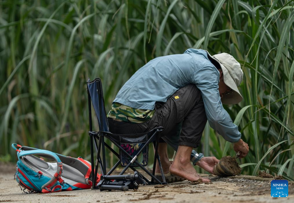 Researcher Li Wenqin cleans mud from his sole at a national nature reserve in Luobai Town of Jiangzhou District, Chongzuo City, south China's Guangxi Zhuang Autonomous Region, Aug. 5, 2023. China's white-headed langur is one of the world's most endangered primate species. Characterized by the white hair on their heads, the animals are spotted in less than 200 square km karst hills between the Zuojiang and Mingjiang rivers in Chongzuo.