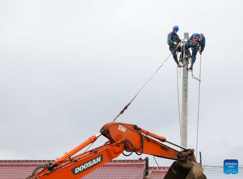 Workers repair wire damaged by flood water in Kaiyuan Town of Shulan City, northeast China's Jilin Province, Aug. 6, 2023. Shulan had experienced continuous rainy weather since Tuesday night. This round of rain has basically ended.