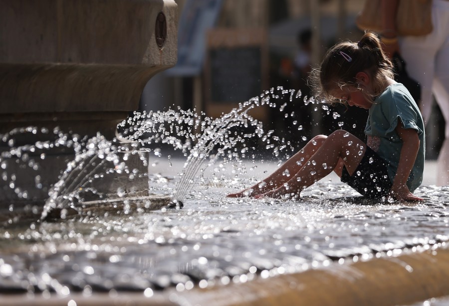 A girl cools herself at a fountain of Three Graces on the Place de Comedie as the highest temperature reaches 38 degrees centigrade in Montpellier, southern France, July 19, 2023. (Xinhua/Gao Jing)