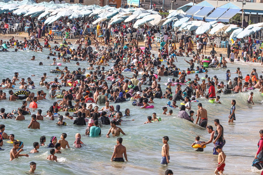 People cool off at a beach of the Mediterranean sea during a heatwave in Alexandria, Egypt, on July 6, 2023. (Xinhua/Ahmed Gomaa)