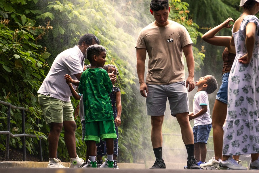 People cool themselves under a water cooling station at the Smithsonian National Zoo in Washington, D.C., the United States, July 26, 2023. (Photo by Aaron Schwartz/Xinhua)