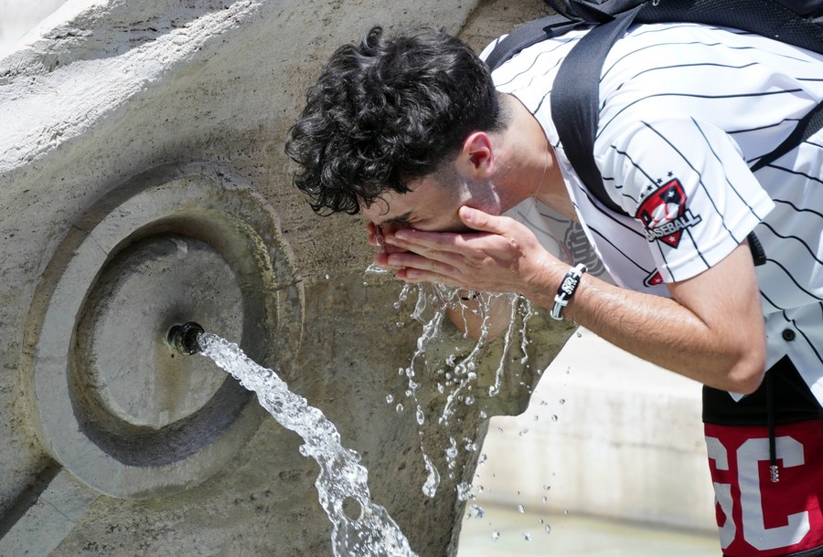 A man refreshes himself with water from the Barcaccia Fountain in the Piazza di Spagna in Rome, Italy, on July 10, 2023. (Xinhua/Jin Mamengni)