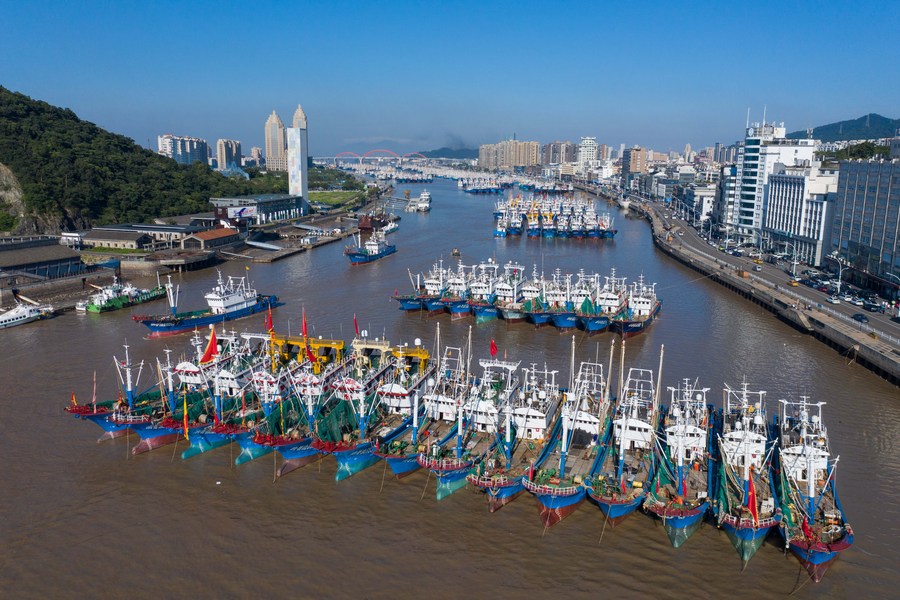 This aerial photo taken on Aug. 6, 2023 shows fishing boats at Shenjiamen port in Zhoushan City, east China's Zhejiang Province. (Xinhua/Xu Yu)