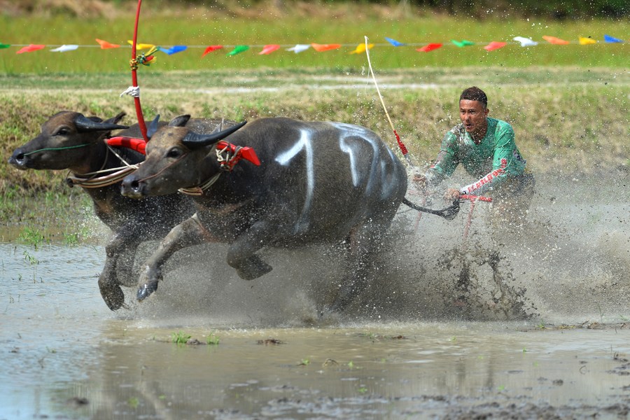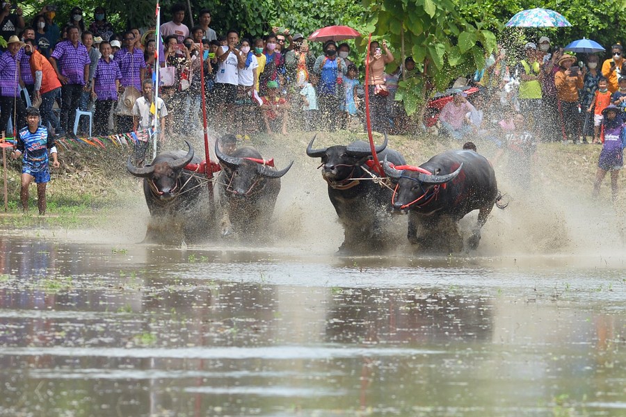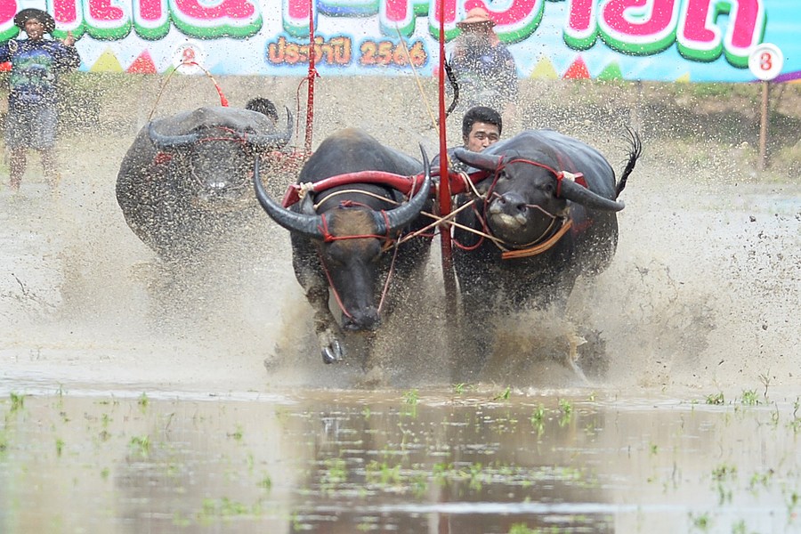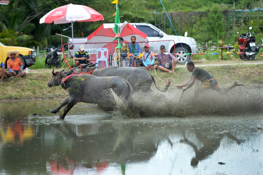 Buffalo racers compete during a buffalo race to celebrate the start of paddy-sowing season in Chonburi, Thailand, on Aug. 6, 2023. (Xinhua/Rachen Sageamsak)