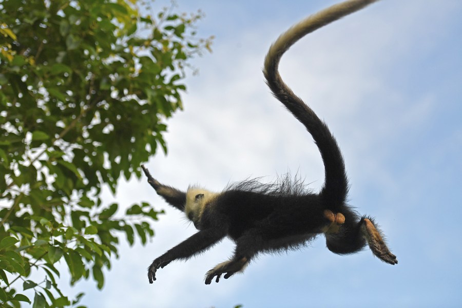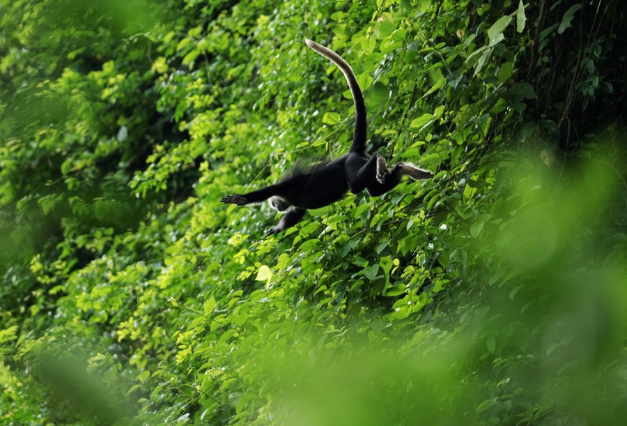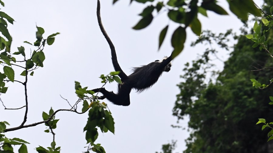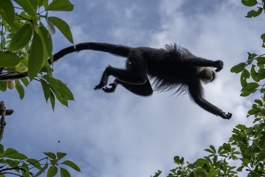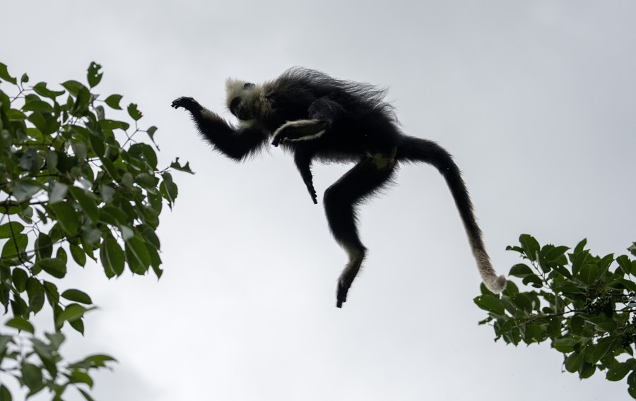 A white-headed langur leaps at a national nature reserve in Luobai Town of Jiangzhou District, Chongzuo City, south China's Guangxi Zhuang Autonomous Region, Aug. 5, 2023. (Xinhua/Zhou Hua)