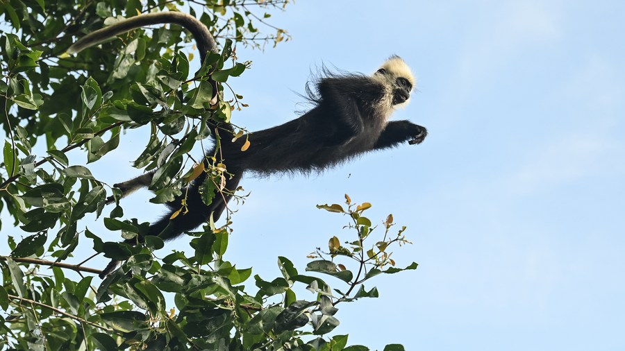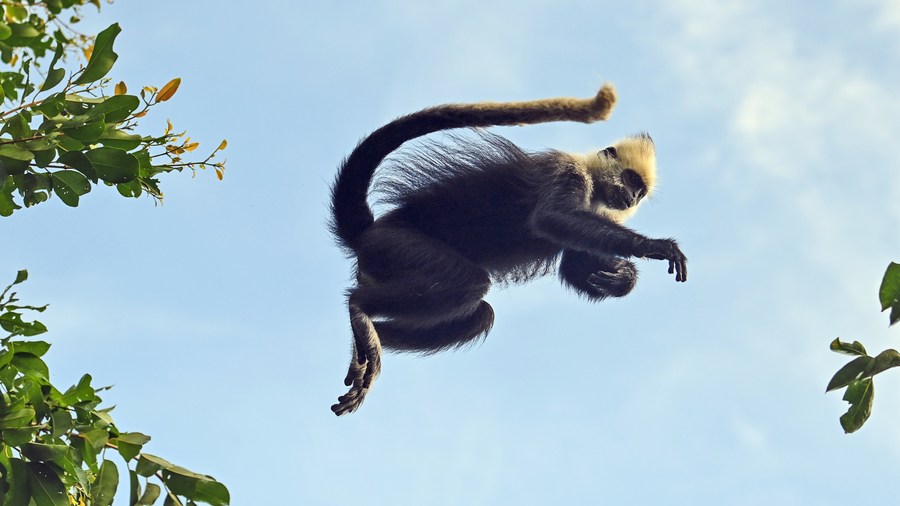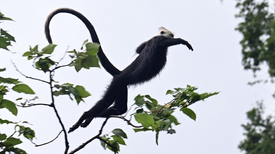 A white-headed langur leaps at a national nature reserve in Luobai Town of Jiangzhou District, Chongzuo City, south China's Guangxi Zhuang Autonomous Region, Aug. 5, 2023. (Xinhua/Zhang Ailin)