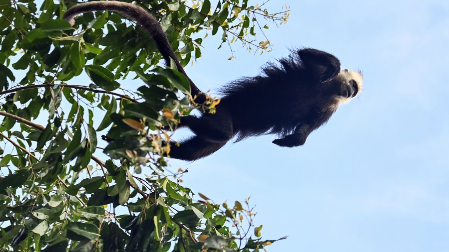 A white-headed langur forages at a national nature reserve in Luobai Town of Jiangzhou District, Chongzuo City, south China's Guangxi Zhuang Autonomous Region, Aug. 4, 2023. (Xinhua/Zhou Hua)
