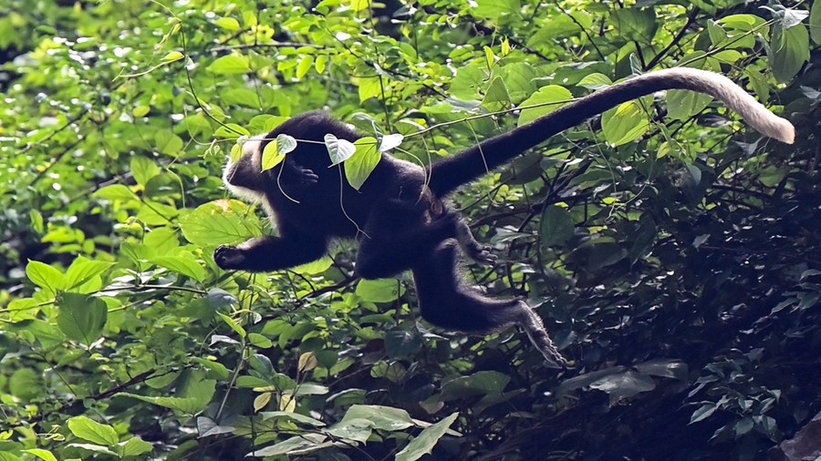 A white-headed langur leaps at a national nature reserve in Luobai Town of Jiangzhou District, Chongzuo City, south China's Guangxi Zhuang Autonomous Region, Aug. 5, 2023. (Xinhua/Fei Maohua)