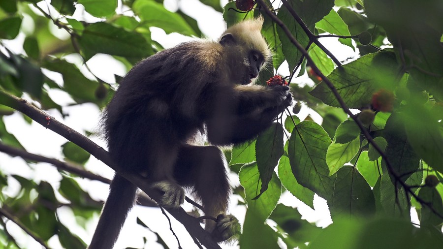 A white-headed langur forages at a national nature reserve in Luobai Town of Jiangzhou District, Chongzuo City, south China's Guangxi Zhuang Autonomous Region, Aug. 4, 2023. (Xinhua/Zhang Ailin)