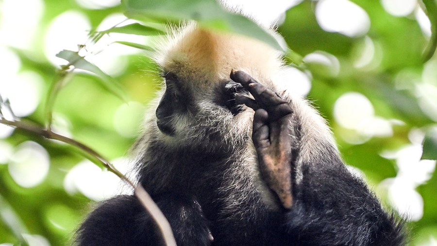 A white-headed langur cleans its ears at a national nature reserve in Luobai Town of Jiangzhou District, Chongzuo City, south China's Guangxi Zhuang Autonomous Region, Aug. 4, 2023. (Xinhua/Zhang Ailin)■