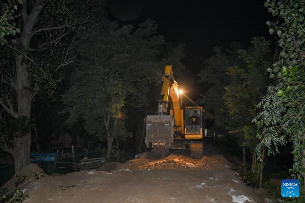A worker operates a machinery to bolster river embankments in Taitou Town of Jinghai District, north China's Tianjin Municipality, Aug. 7, 2023. The water level of the Taitou section of the Daqinghe River continued to rise, reaching about six meters on Wednesday morning. Rescue personnel patrol day and night over the villages and the river embankments are bolstered as a preparation for any emergency. (Xinhua/Sun Fanyue)