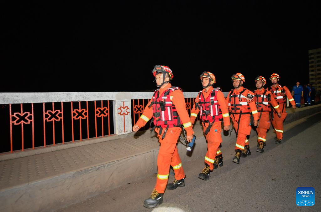 Firefighters walk on a bridge while patrolling villages in Taitou Town of Jinghai District, north China's Tianjin Municipality, Aug. 9, 2023. The water level of the Taitou section of the Daqinghe River continued to rise, reaching about six meters on Wednesday morning. Rescue personnel patrol day and night over the villages and the river embankments are bolstered as a preparation for any emergency. (Xinhua/Sun Fanyue)