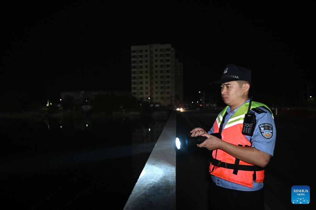 A police officer checks the condition of the Daqinghe River on a bridge in Taitou Town of Jinghai District, north China's Tianjin Municipality, Aug. 9, 2023. The water level of the Taitou section of the Daqinghe River continued to rise, reaching about six meters on Wednesday morning. Rescue personnel patrol day and night over the villages and the river embankments are bolstered as a preparation for any emergency. (Xinhua/Sun Fanyue)