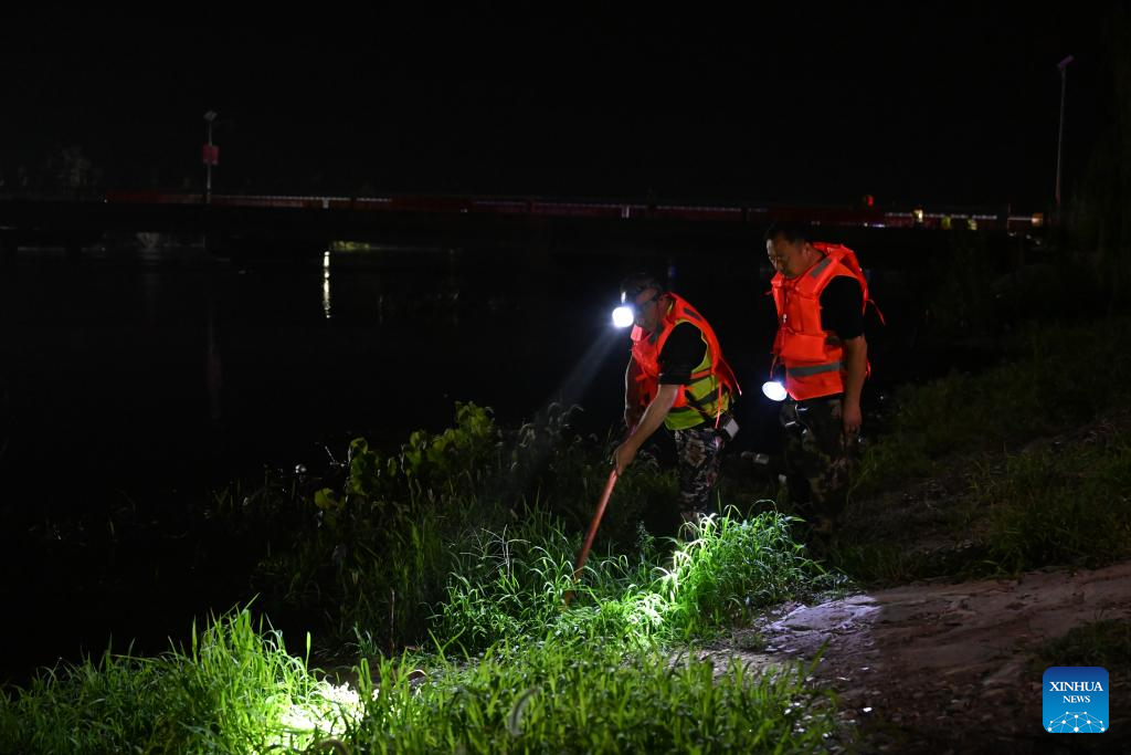 People patrol the embankments in Taitou Town of Jinghai District, north China's Tianjin Municipality, Aug. 7, 2023. The water level of the Taitou section of the Daqinghe River continued to rise, reaching about six meters on Wednesday morning. Rescue personnel patrol day and night over the villages and the river embankments are bolstered as a preparation for any emergency. (Xinhua/Sun Fanyue)