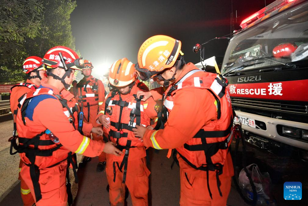 Firefighters prepare themselves before patrolling villages in Taitou Town of Jinghai District, north China's Tianjin Municipality, Aug. 9, 2023. The water level of the Taitou section of the Daqinghe River continued to rise, reaching about six meters on Wednesday morning. Rescue personnel patrol day and night over the villages and the river embankments are bolstered as a preparation for any emergency. (Xinhua/Sun Fanyue)
