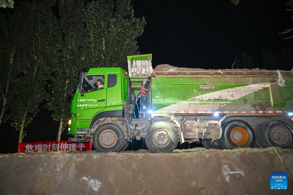 A worker drives a truck to deliver materials for bolstering river embankments in Taitou Town of Jinghai District, north China's Tianjin Municipality, Aug. 7, 2023. The water level of the Taitou section of the Daqinghe River continued to rise, reaching about six meters on Wednesday morning. Rescue personnel patrol day and night over the villages and the river embankments are bolstered as a preparation for any emergency. (Xinhua/Sun Fanyue)